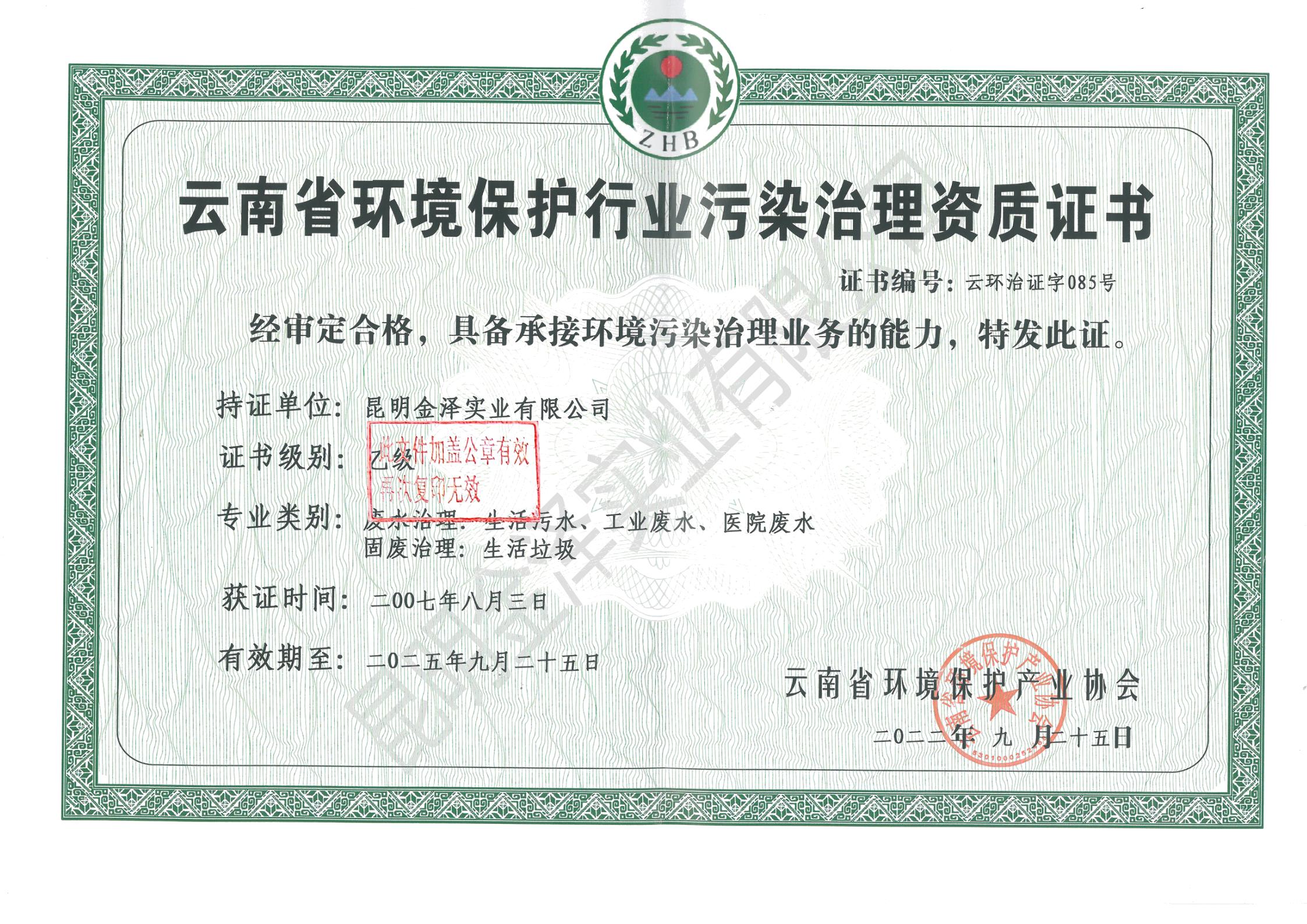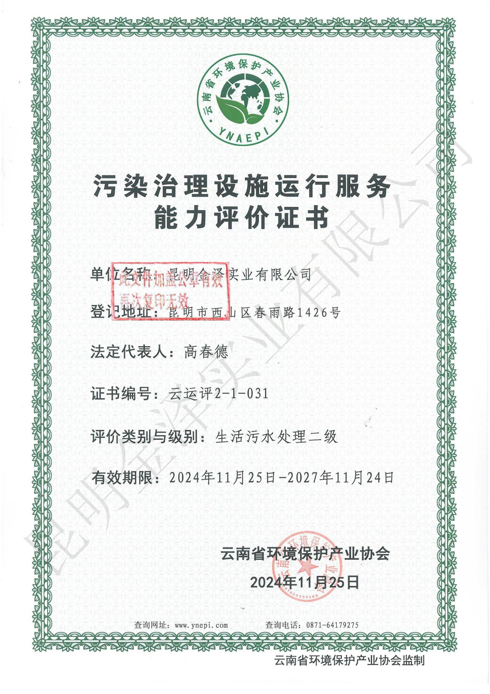 二級生活污水處理運行服務(wù)資質(zhì)證書(shū)