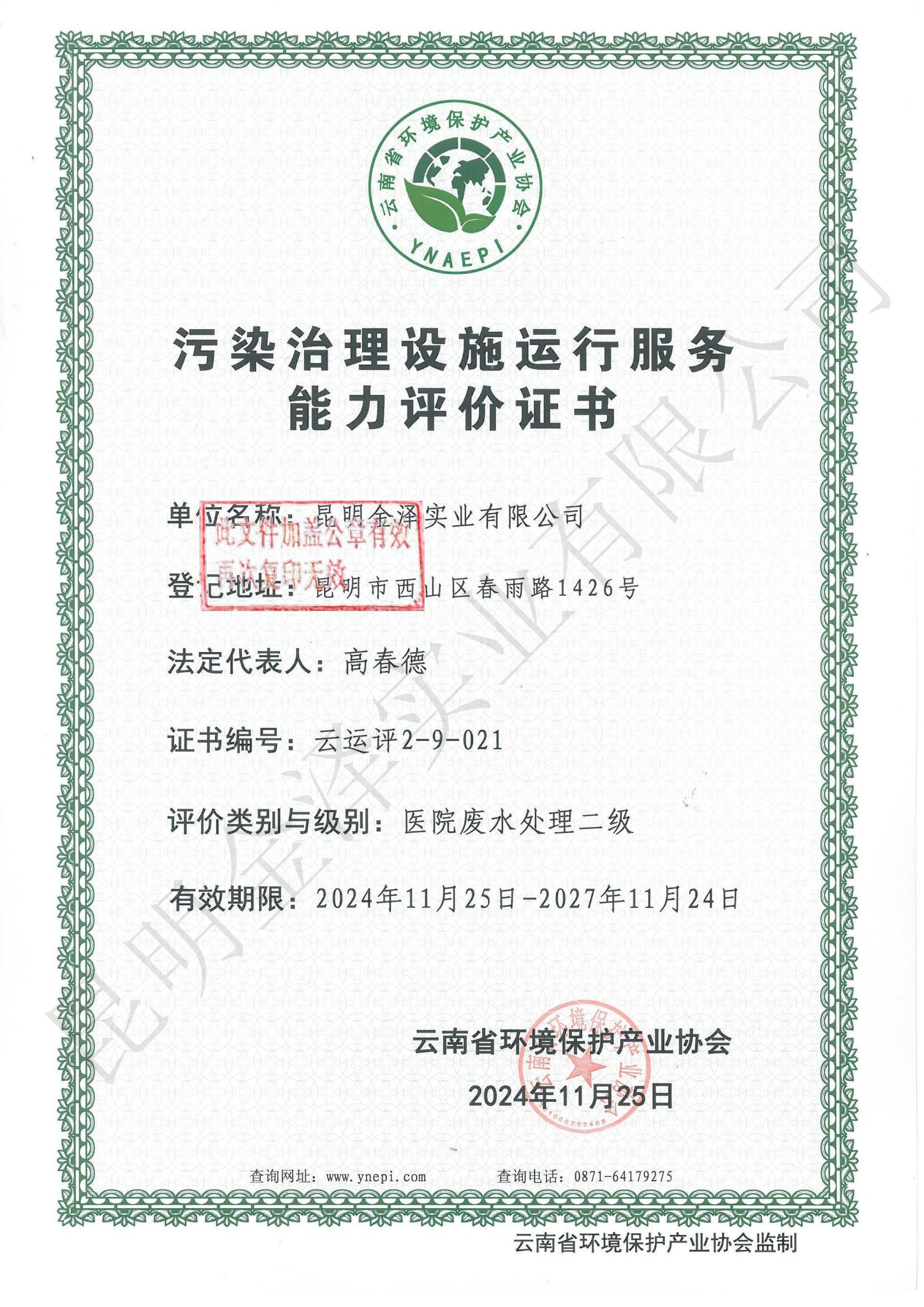 二級醫院廢水處理運行服務(wù)資質(zhì)證書(shū)